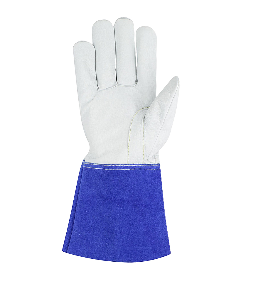 The palm, seamless forefinger and thumb made of goatskin are designed to provide a firm grip and protection from abrasion. Goatskin is a durable and flexible material that can withstand frequent use and exposure to various elements. The split leather top hand provides excellent protection from high temperatures. The wrist of this welding glove has elasticity, which can better adapt to everyone’s wrists of different sizes and can prevent debris and electric sparks from entering the glove. Wing thumb design not only enhances the fit and flexibility of the glove but also allows the user to perform tasks with more precision and comfort. It also reduces the stress on the thumb joint and prevents fatigue. Reinforced thumb saddle for enhanced durability in high wear areas and stress points. 15cm gauntlet Blue cow split cuffs that extend beyond the wrists and cover part of the forearms provide extra protection from cuts, abrasions, and burns that may occur during various tasks. Whether you are working with sharp tools, hot materials, or chemicals, you can rely on our gloves to shield your skin from harm. Keep your hands cozy and protected with the perfect combination of fleece and denim lining, providing superior comfort and outstanding warmth retention. Our product offers you the perfect solution to ensure your safety and protection in any circumstance, providing you with utmost reassurance of its reliability and durability.